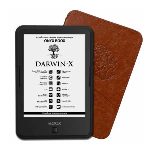 ONYX BOOX Darwin X, arkadan aydınlatmalı ve dokunmatik kontrollere sahip 6 inç E Ink Carta Plus (Carta 1300) ekrana sahip kompakt bir okuyucudur. Model, üreticinin en popüler serisine devam ediyor ve kontrol düğmeli klasik bir kasada üretiliyor. Darwin X, modern, yüksek performanslı bir işlemciye dayanmaktadır ve 2 GB RAM ve 32 GB dahili belleğe sahiptir. Okuyucu, İnternet'e erişmenizi ve çeşitli ağ hizmetlerini kullanmanızı sağlayan çift bantlı bir Wi-Fi modülüyle donatılmıştır. Bluetooth desteği, kulaklıklar ve hoparlörler de dahil olmak üzere kablosuz cihazları bağlamanıza olanak tanır. Android 11 işletim sistemi sayesinde okuyucuya çeşitli üçüncü taraf uygulamaları yükleyebilirsiniz. Okuyucu yazılımında bulunan ses oynatıcı, müzik ve sesli kitap dinlemeyi mümkün kılar ve TTS işlevi desteği, metin dosyalarını okumanıza olanak tanır.