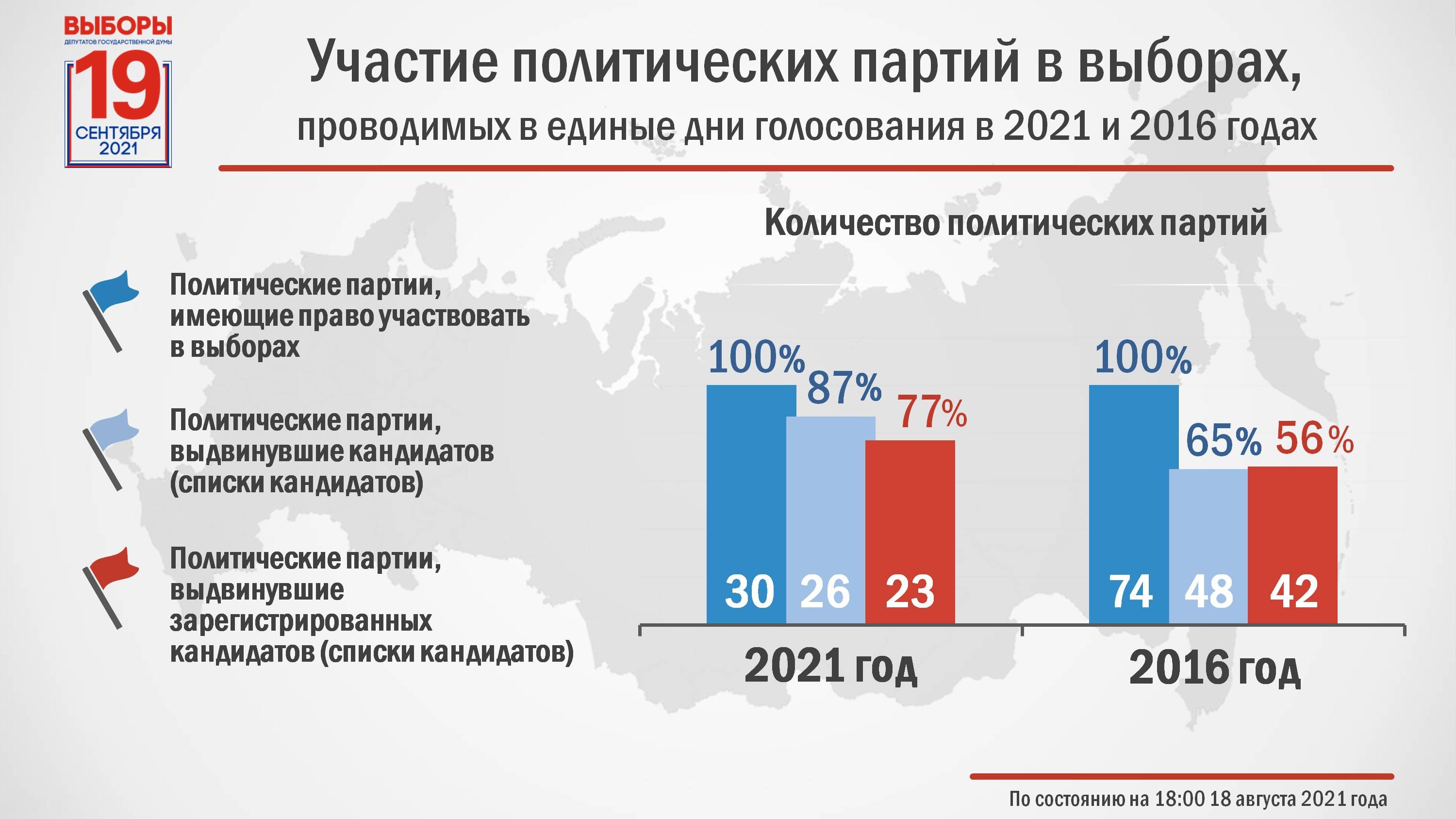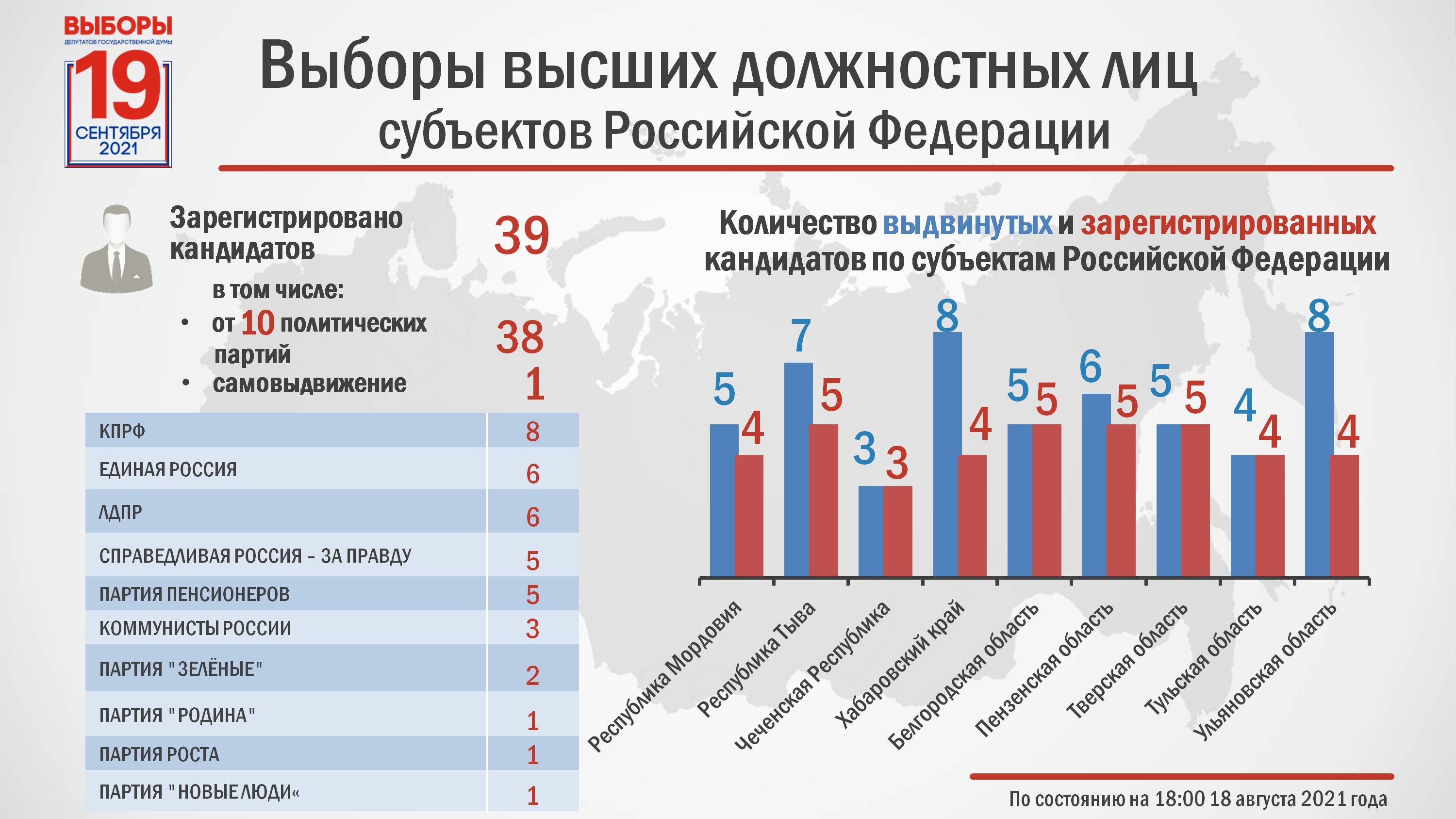 ЕДГ-2021. Выдвижение и регистрация кандидатовЦИК РоссииДанные представлены по состоянию на 18:00 18 августа 2021 года