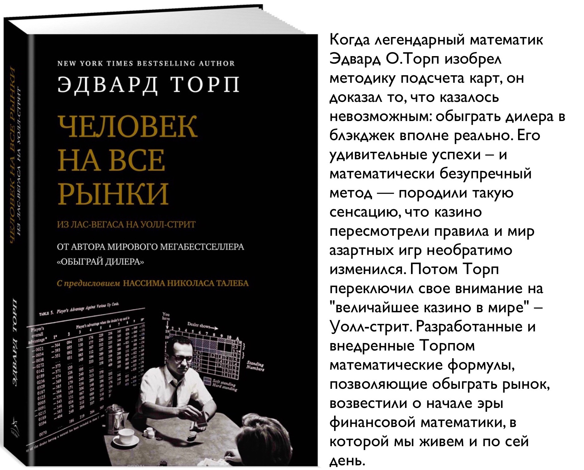 Вот этот контекст. Эд Торп стал первым современным математиком, сумевшим успешно применить численные методы в области оценки рисков – и, несомненно, первым математиком, добившимся при этом финансового успеха. Впоследствии возникла целая когорта таких финансовых математиков – «квантов» (специалистов по биржевому анализу), в которую входят, например, молодые гении из отделения прикладной математики Университета штата Нью-Йорк в Стоуни-Брук, – но Торп остается их старейшиной.