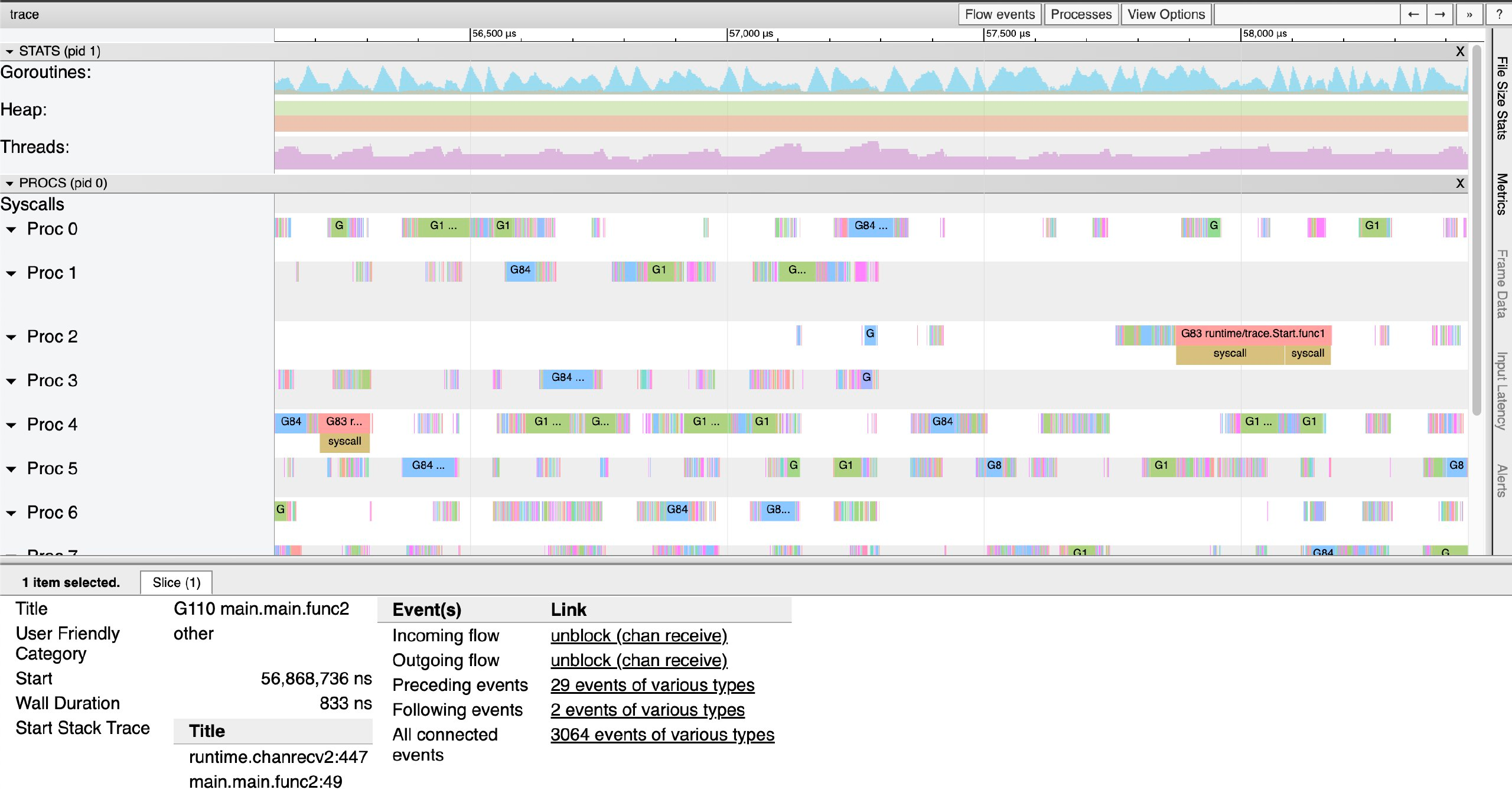 Магия трассировки заключается в том, что она может легко выявить такие вещи в программе, которые трудно увидеть другими способами. Например, узкое место параллелизма, когда множество горутин блокируют один и тот же канал, может быть довольно трудно увидеть в профиле процессора, потому что нет исполнения для сэмпла. Но в трассировке отсутствие исполнения будет видно с удивительной четкостью, а трассировка стека заблокированных горутин быстро укажет на виновника.