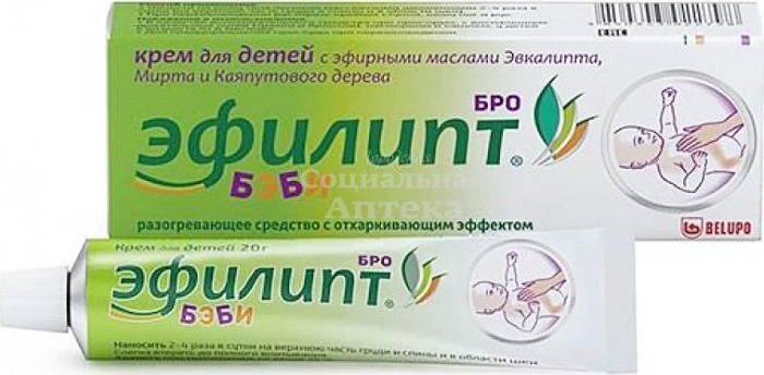 Эфилипт Бро Бэби - разогревающий детский крем, состоящий из растительных компонентов . Эффективно борется с простудой, в том числе кашлем и насморком . Эффективность 9/10 Особые указания Нельзя наносить крем на слизистые оболочки, ожоговые и раневые поверхности . При попадании в глаза или на слизистую оболочку промыть холодной водой .