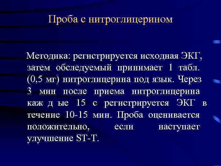 Проба проводится натощак, обследуемый должен находиться в горизонтальном положении . Сначала регистрируется исходная ЭКГ . Затем обследуемый принимает под язык 0,5 мг (1 таблетку) или 3 капли 0,1% раствора нитроглицерина . Повторная ЭКГ регистрируется на 5-й и 10-й минутах после приема нитроглицерина . Оценка результатов .