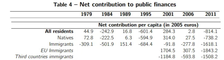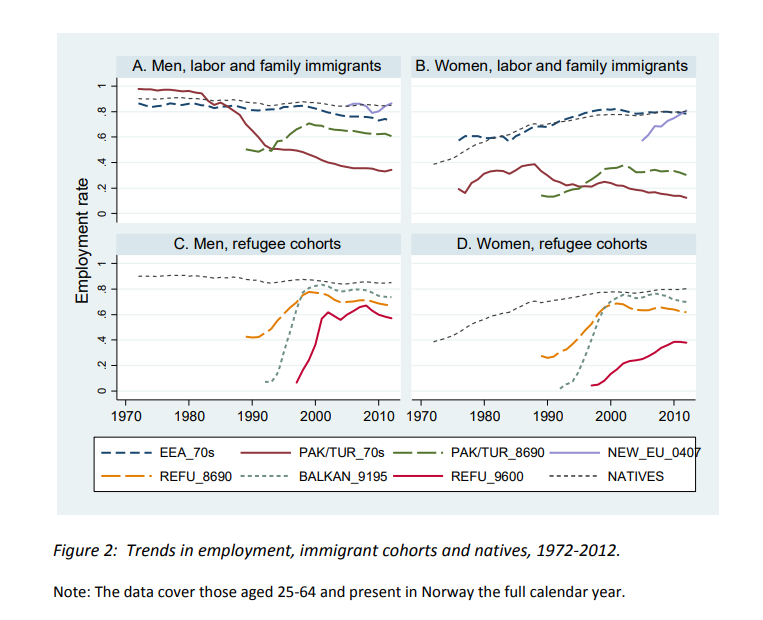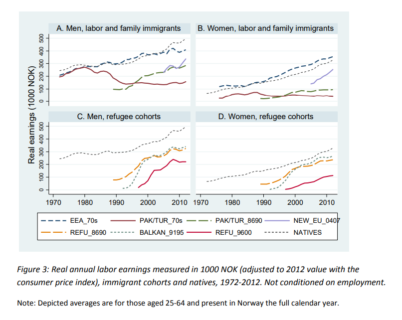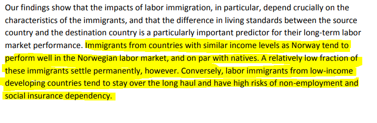 В Норвегии исследовали вопрос вклада мигрантов за период 1970-2012. И если мигранты из ЕЭС примерно соответствовали коренным норвежцам в плане заработка и занятости, то мигранты из Турции/Пакистана показывали негативный вклад.