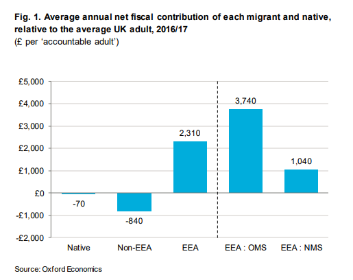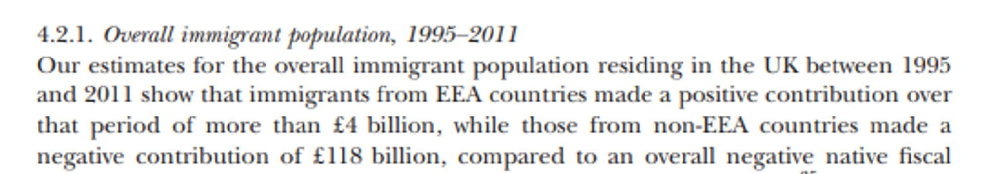 Исследование 2014 года показало, что за период 1995-2011, что иммигранты стоили соединённому королевству 114 миллиардов фунтов стерлингов. При этом не все мигранты были одинаковы. Так, если мигранты из Европейской Экономической Зоны (ЕС + Норвегия, Исландия и Лихтенштейн - прим.) внесли положительный вклад в 4 миллиарда, то мигранты из остальных частей света стоили казне 118 миллииардов.