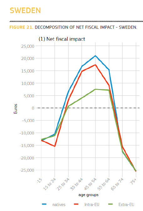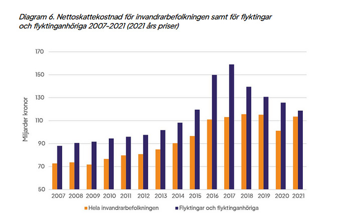 Во время мигрантского кризиса 2015 года Швеция приняла наибольшее число беженцев в перерасчёте на душу населения. В шведском докладе сказано, что нетто-затраты на мигрантов и их родственников составляют $10 миллиардов. Средние нетто-затраты составляют 2.38% ВВП.