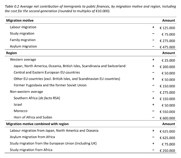 Также, как и в Соединённом Королевстве, в Нидерландах европейские иммигранты являются нетто-вклдачиками (€25,000), в то время как мигранты из остальных стран являются нетто-потребителями (-€275,000).