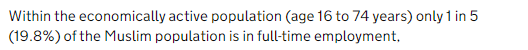 Что насчёт работы? Предсказуемо наибольшую занятность имели белые, наименьшую - бангладешцы и пакистанцы. При этом лишь каждый пятый мусульманин рабочего возраста имеет полную занятость.
