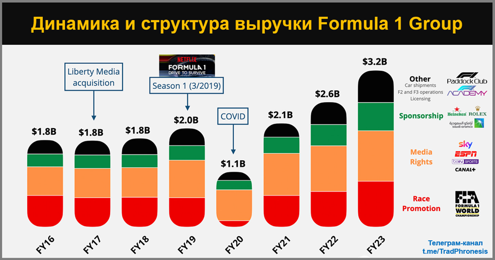 🏢 Группа Формула-1: с 2017 года принадлежит Liberty Media и владеет коммерческими правами на Формулу-1. Она заключает сделки, заключает выгодные контракты с трассами на проведение гонок, обеспечивает права на трансляцию и привлекают крупных спонсоров.