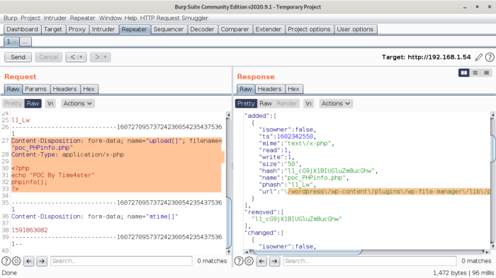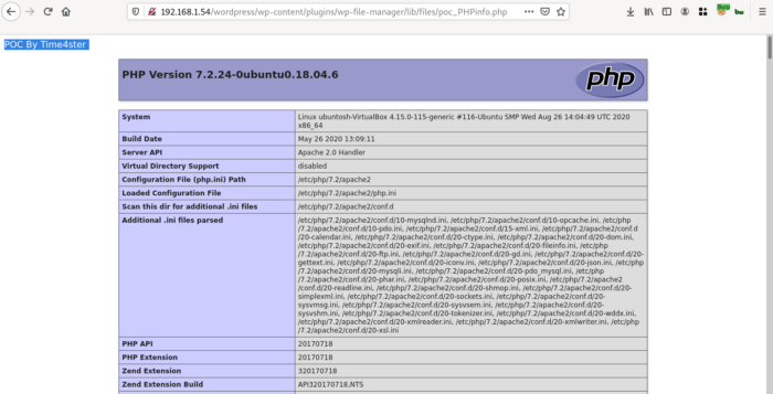 Загруженный файл можно найти по адресу: http://192.168.1.54/wordpress/wp-content/plugins/wp-file-manager/lib/files/poc_PHPinfo.php