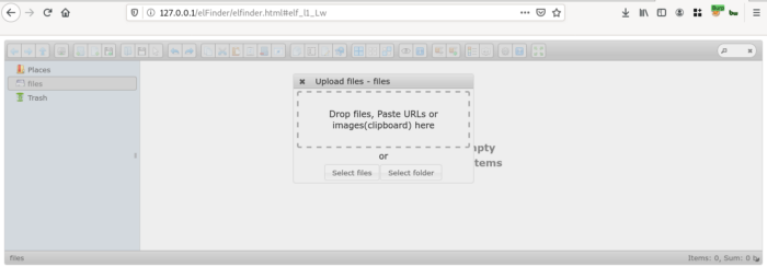 При посещении /elFinder.html отображается меню файлового менеджера с возможностью загрузки файлов:
