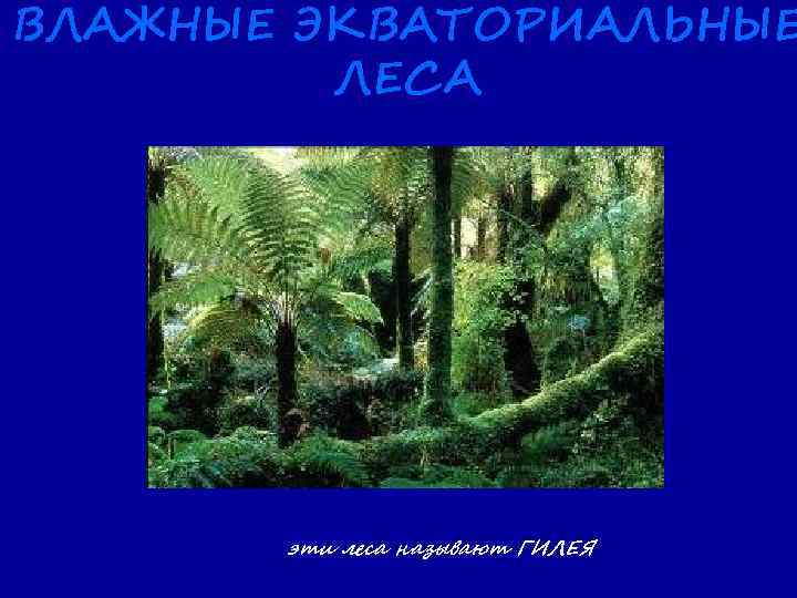 Влажные экваториальные леса - встречаются в тропических, субтропических и экваториальных районах с влажным климатом . Эти леса встречаются на четырёх континентах нашей планеты .