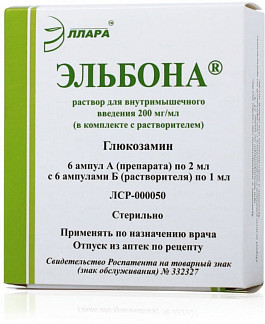 Эльбона Состав . Раствор 1 — глюкозамина сульфата, трометамол, хлорид натрия, лидокаина гидрохлорид, очищенная вода . Раствор 2 (растворитель) — диэтаноламин, стерильная вода . Форма выпуска