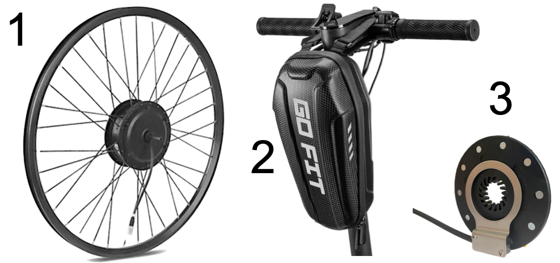Начальный комплект состоит из 3-х деталей: мотор колесо, блок электроники с акб и датчик PAS.