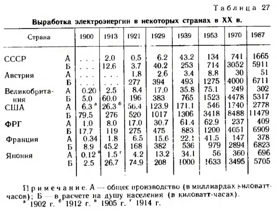 Часто,чтобы показать "отсталость" Российской империи в выработке электроэнергии любят показывать,что выработка электроэнергии на душу населения была ниже,чем в развитых странах.Действительно,у России в 1913 году среднедушевая выработка была ниже,чем в развитых странах.Но СССР на 1939 год находился в худшем положении.К примеру средедушевая выработка на 1913 год составила 42% от уровня Франции,а в 1939 году 28%.