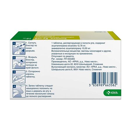 Элицея КУ Таб таблетки дисперг 10мг 56 шт Элицея КУ-Таб таблетки дисперг 10мг 56 шт . Действующее вещество (МНН): Эсциталопрам Производитель: АО КРКА, д .д ., Ново место Страна производства: Словения