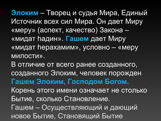 Имя Элоким, поддерживающее законы природы, ассоциируется с мерой справедливости, т .е . рационального распределения энергии «по справедливости» .