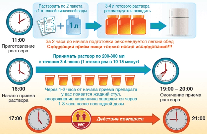 В этот момент, а иногда и быстрее (спустя 30 минут после принятой первой части дозы), наступает дефекация . Чем больше времени человек принимает Эндофальк, тем быстрее и сильнее происходит опорожнение кишечника . Полное очищение кишечника наступает спустя 4-6 часов .