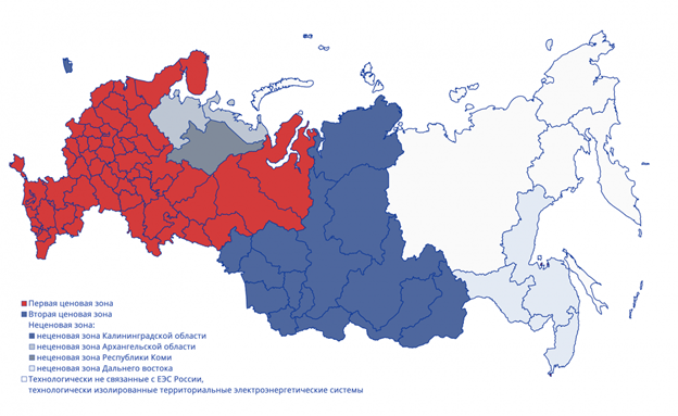 Начнем с географии. Минэнерго выделяет в России две ценовые зоны, все остальное пространство – неценовые зоны. В чем отличие – в ценовых зонах есть рыночный механизм ценообразования энергии, а в неценовых нет.