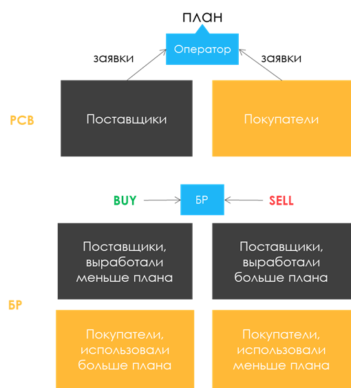 БР – балансирующий рынок. План потребления энергии всегда немного расходится с фактом, и для этого есть балансирующий рынок. На нем участвуют как потребители, так и поставщики энергии. Если потребитель энергии видит, что расход меньше плана, он может продавать излишки на балансирующем рынке, если энергии не хватает – он ее там докупает. В свою очередь поставщик энергии может выработать больше плана – тогда он будет продавать излишки на БР. А если поставщик по каким-то причинам выработал энергии меньше плана – он докупает ее на БР.