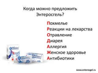 Похмелье Энтеросгель от похмелья Энтеросгель — энтеросорбент №1 для уменьшения вреда от приема алкоголя: применяется для профилактики опьянения, ускорения отрезвления и предотвращения похмелья . Энтеросгель впитывает в себя алкоголь и продукты его распада — ацетальдегид, который вызывает похмельный синдром .