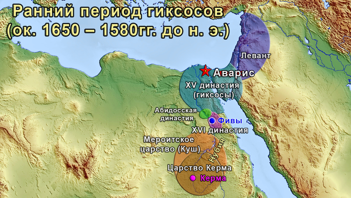 Еще одна орда завоевателей смешенного происхождения, вооруженная арийскими военными технологиями – гиксосы в XVII в. до н.э. вторглась в Египет ослабленный смутами по завершении эпохи Среднего царства. Вооруженные колесницами и составными луками гиксосы захватили значительную часть Египта, создали свое государство со столицей в Аварисе в дельте Нила, и установили его коммуникацию с Азией, частью которой стало переселение в Египет семитского рода потомков Авраама, будущих евреев.