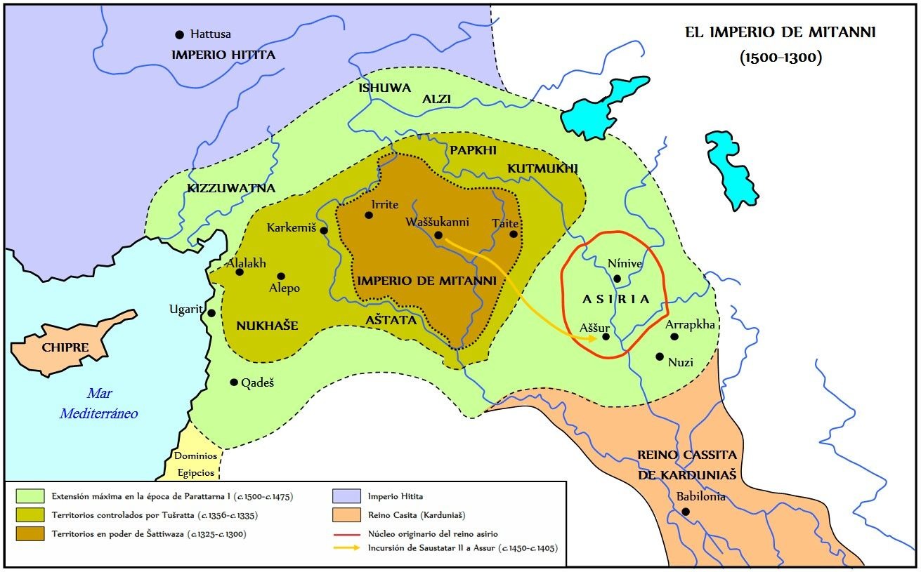 В соперничающим с Митанни Хеттском царстве, индоевропейской группе, отделившейся от основного потока в глубокой древности и переместившейся в Малую Азию, а потому не знавшей ни коневодства, ни колесниц, сохранился трактат по коневодству, написанный митаннийцем Киккули с использованием индоарийской лексики. Маршрут прихода индоариев в Сирию определить трудно – возможно они передвигались через север иранского нагорья на Запад, но вероятен и маршрут из южнорусских степей, через Кавказ и Закавказье на юг.