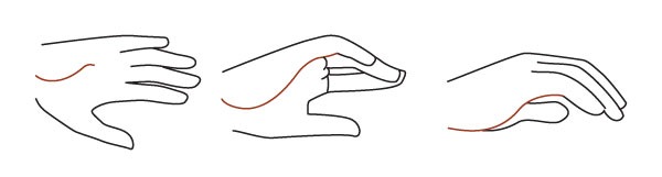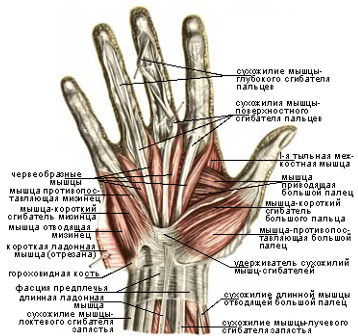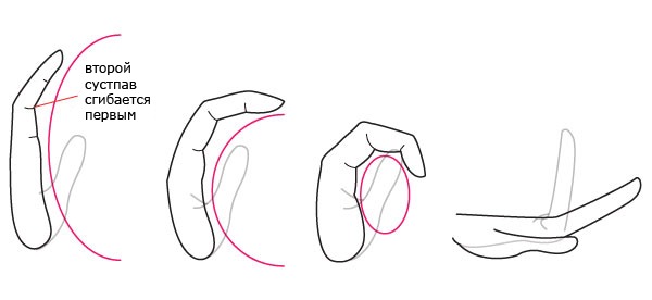 Каждый из четырех сонаправленных пальцев имеет похожую физиологию движения за счет сгибания в суставе при работы работы мышц и сухожилий, в то время как большой палец имеет значительное отличие: