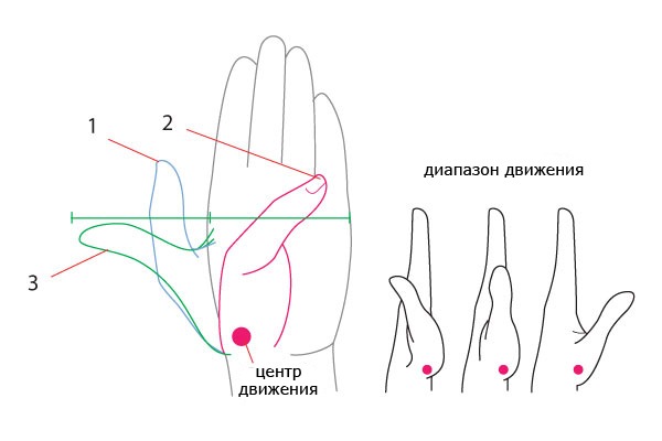 Большой палец находясь в расслабленным состоянии (1), при использовании приводящих мышечных групп (2) и при использовании отводящих мышечных групп (3). Как можно заметить, движение происходит по радиальной траектории. Воспользуемся этими данными и расширим рассматриваемую поверхность: