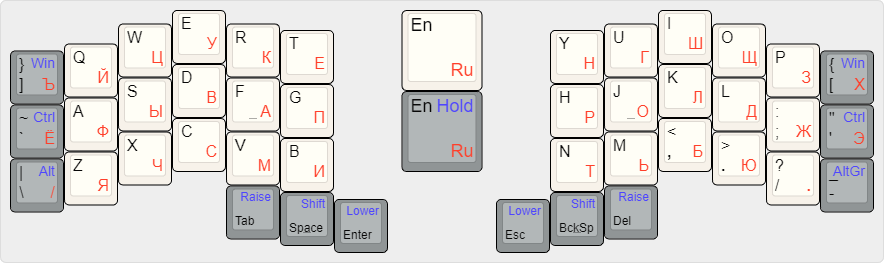 Если взять за основу мою раскладку на 42 кнопки и убрать по одной крайней колонке с каждой стороны, то вроде бы теряем мы не так и много (Ъ, Ё, /, Х, Э, -). Потеря символов, конечно, печальна, но в целом терпима. Их вполне можно поместить на аккорды, хотья это ломает привычку работы за другими клавиатурами. Потеря модификторов, которые в моей раскладке расположены на крайних колонках куда большая проблема. Моды можно перенести в слой, перенести на аккорд, сделать oneshot, home row mods, или просто сделать слой с популярными хоткеями.
