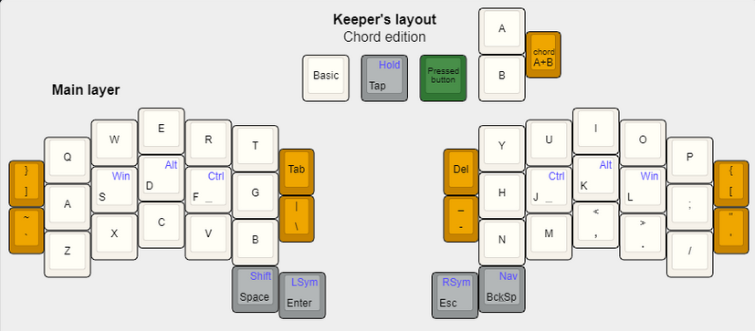 Сколько я не пробовал home row mods я так и не смог избавиться от периодически появляющихся у меня мисскликах. Пока моды были на крайних кнопках проблем не было, вероятно, потому что эти кнопки реже используются при обычной печати, а когда мод тапы перенеслись на самые частые буквы начали появляться проблемы с ложной активацией. Аккорды в этом плане выглядят более изящным решением. Но зажимать две клавиши всегда менее удобно, чем одну, да и все равно придется использовать вторую руку.