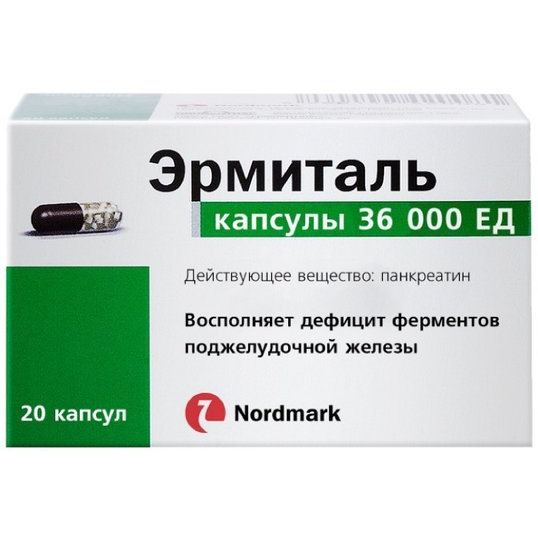 Эрмиталь, 20 шт ., 10 тыс . ЕД, капсулы в 529 аптеках, найти аптеку Цена в Краснодаре от 183 руб . +1 Купить Действующее вещество (МНН) Панкреатин Дозировка или размер 10 тыс . ЕД Форма выпуска капсулы Первичная упаковка флакон темного стекла Производитель Нордикс Фарма Фертриб ГмбХ Страна Германия Доставка и оплата