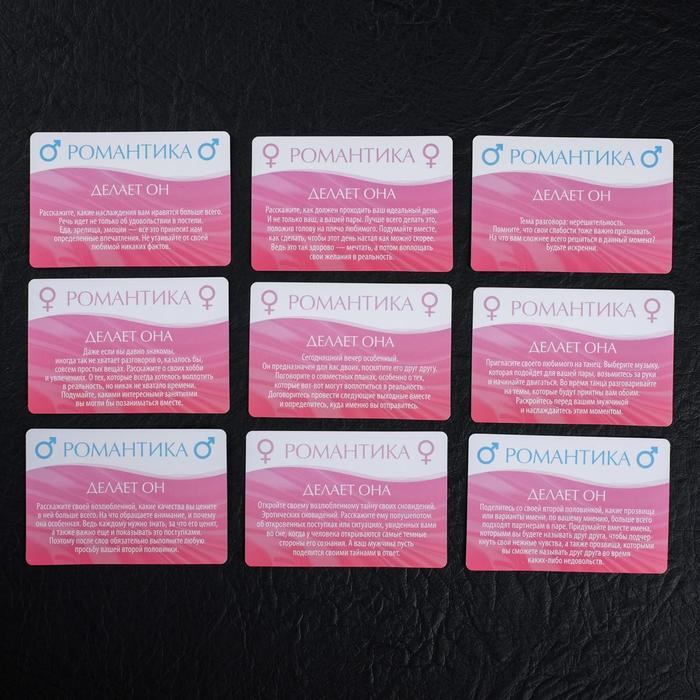 Игроки по очереди выполняют задания, написанные на карточках. Их содержимое может включать как скромные романтические вопросы, которые позволят вам лучше узнать друг друга, так и более откровенные действия. Какое задание вам выпадет — определяет кубик.