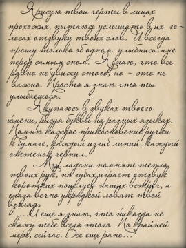 «Здравствуй любимый! Сегодня, когда я днем прилегла отдохнуть, я вспомнила о тебе, и мне безумно захотелось заняться с тобой любовью. Как в тот вечер, помнишь? Я помню, как ты впервые прикоснулся ко мне. Как взял меня за руку и робко обнял. Помню, как ты впервые взял меня за бедра и крепко прижал к стене. Я все помню. Твой томящий взгляд, твоё прерывистое дыхание. Я знала тогда, о чем ты думаешь и чего хочешь, но сдерживала тебя, хотя это было не так легко. Ведь сложно противостоять человеку, пылая от желания впиться губами в его шею и слегка прикусить. Тебе же это нравится? Я знаю, что это так. Помню, как ты вздрагивал, от моих поцелуев на твоем теле, особенно когда я страстно покусывала тебя за шею, и моя рука скользнула острыми коготками по твоей спине…