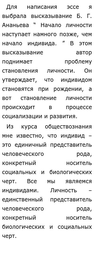 Социология . Личность и индивид . Эссе по обществознанию на тему: «Начало личности наступает намного позже, чем начало индивида» . (Б .Г . Ананьев) Раздел "Социология, социальная психология" . Я выбрала для написания эссе изречение Б .Ананьева «Начало личности наступает намного . . .