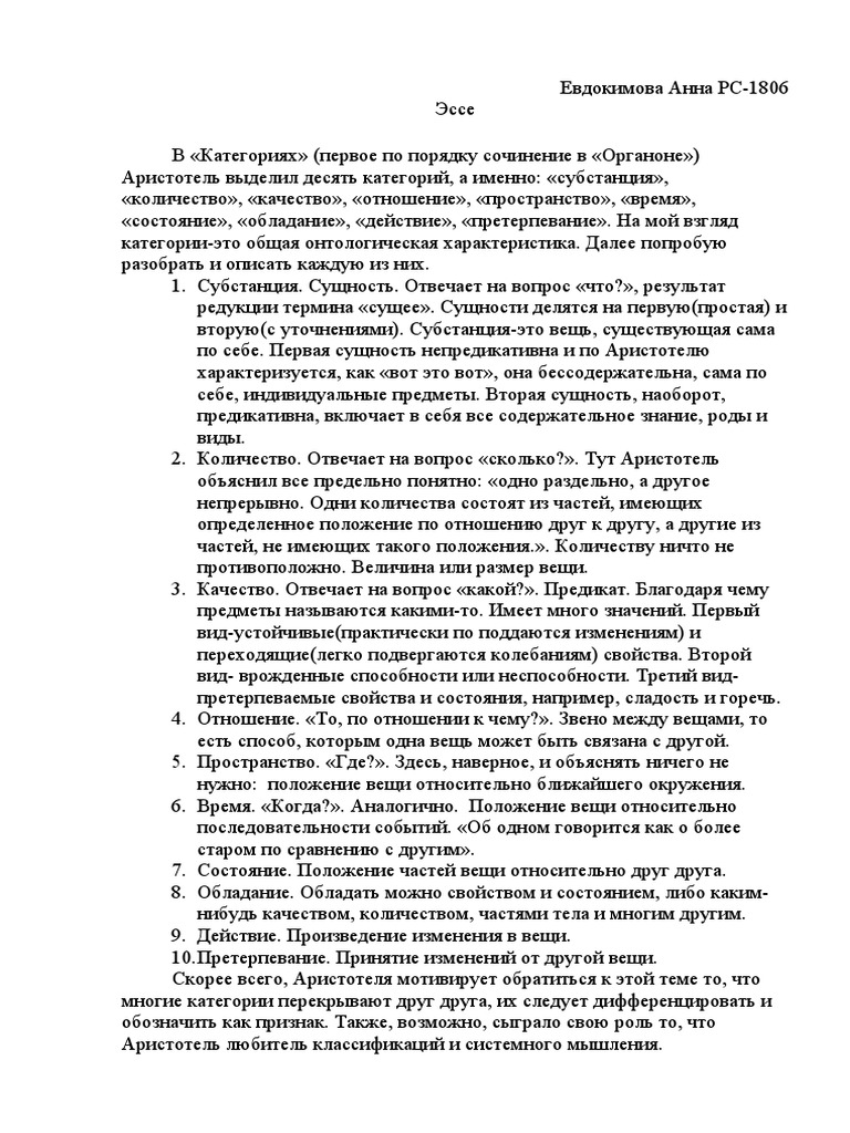 Эссе на тему «Философия Аристотеля: учение о сущности и . . .