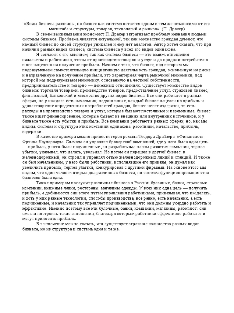 Эссе на тему: Виды бизнеса различны, но бизнес как система остаётся одним и тем же, независимо от его масштаба и структу