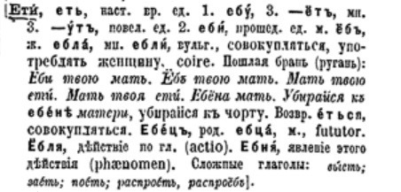 Скан третьего издания Толкового словаря Даля (под ред. Бодуэна де Куртенэ, 1903-1909 гг.) - то было первая в России легально изданная книга, отобразившая матерные слова. И как видим, в начале ХХ века лексическое богатство русского мата значительно уступало совеременному.