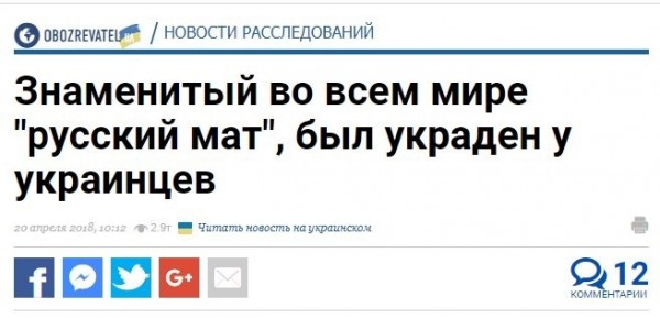 А ведь ещё не так давно, каких -то 15-20 лет назад, украинцы на полном серьёзе рассказывали нам и себе, что они, украинцы, народ высококультурный и матом не ругаются, а кто-то кое-где у нас порой и матерится, то в этом виноваты исключительно русские колонизаторы, навязавшие украинцам свою непристойную брань; рассказывали, что русский мат он на самом татарского происхождения, что у славян матерных слов нет и никогда не было. Но затем концепция поменялась: украинцы - не все, но многие - наконец-то признали, что матом они всё-таки ругаются разговаривают, выяснили, что матерные слова имеются чуть ли ни во всех славянских языках, (в сербском, например), что мат отлично засвидетельствован в исторических источниках домонгольской Руси, признали, что мат стал немаловажной частью современной украинской мовы, и поэтому мантра "русские навязали нам свой азиатский мат" исподволь заменилась на мантру "це наш собственный аутентичный украинский мат" (эту тему сейчас разгоняют многие украинцы - примеры: 1, 2, 3) или даже на "русские украли у нас наш славянский мат":