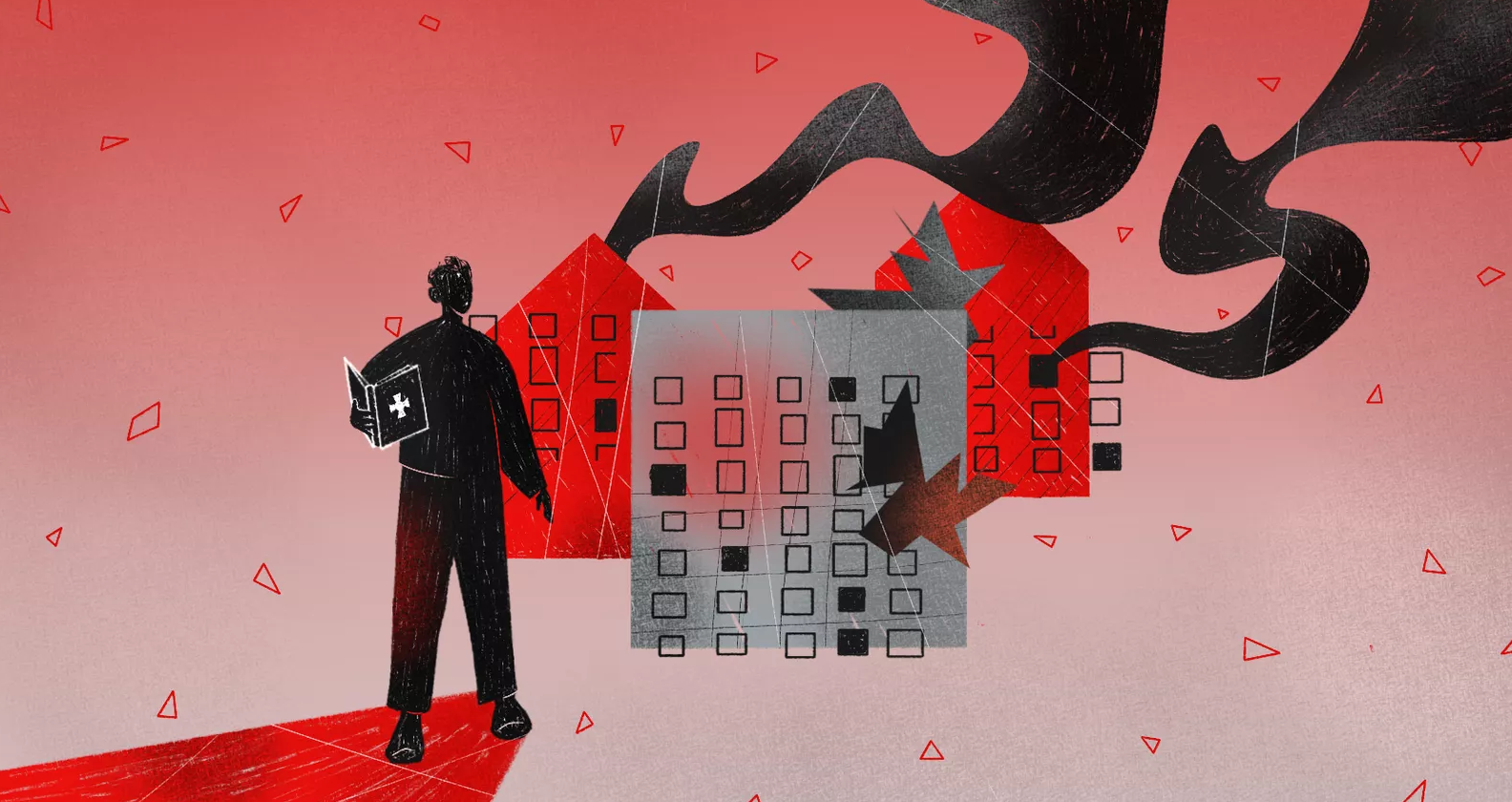 Меж двух строк, в центре плаката, парень увидел перечëркнутые картинки: кулич, крашеное яйцо и… лик Иисуса Христа. Точнее, не лик, а мультяшно-схематичное изображение.
