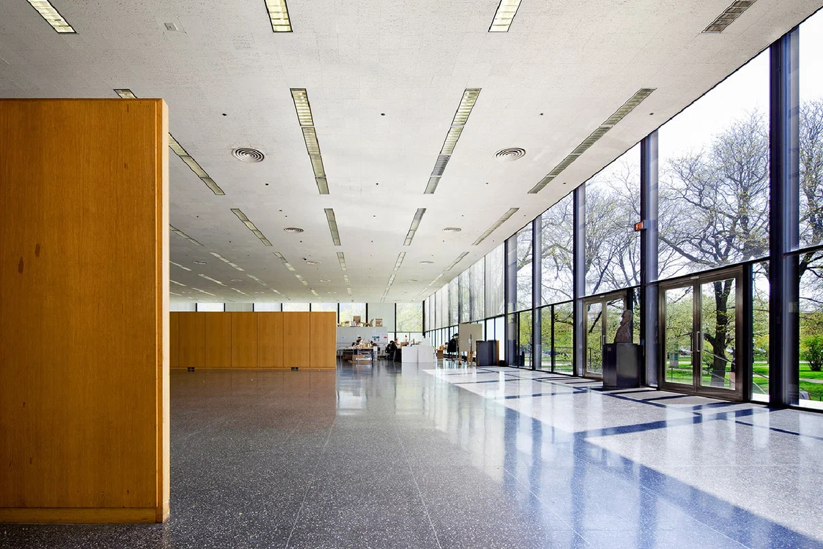 А вот сам институт. Его крыша опирается на четыре стальные балки, которые, в свою очередь, поддерживаются восемью внешними стальными колоннами. Внутреннее пространство здания разделено деревянными мобильными перегородками, разграничивающими помещения для занятий, лекций и выставок