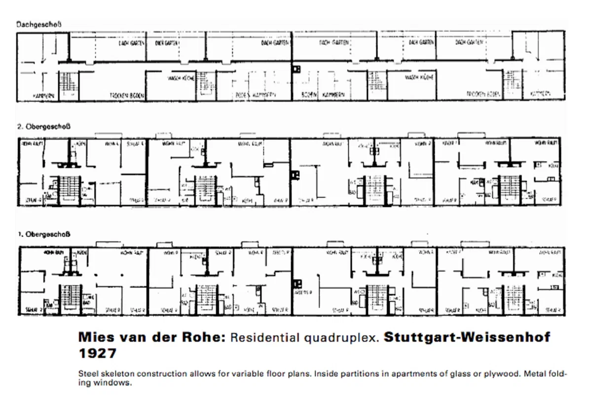 Людвиг Мис ван дер Роэ предложил использовать свободную планировку жилого пространства, когда разрабатывал генплан поселка Вайсенхоф в Штутгарте. Было это в 1927 году. Кухни и санузлы в проекте его домов были зафиксированы на определенных местах, а остальные помещения можно было «нарезать» так, как захочет заказчик. Капитальных стен внутри здания почти не было, поэтому размеры и конфигурация отдельных квартир могли быть любыми.