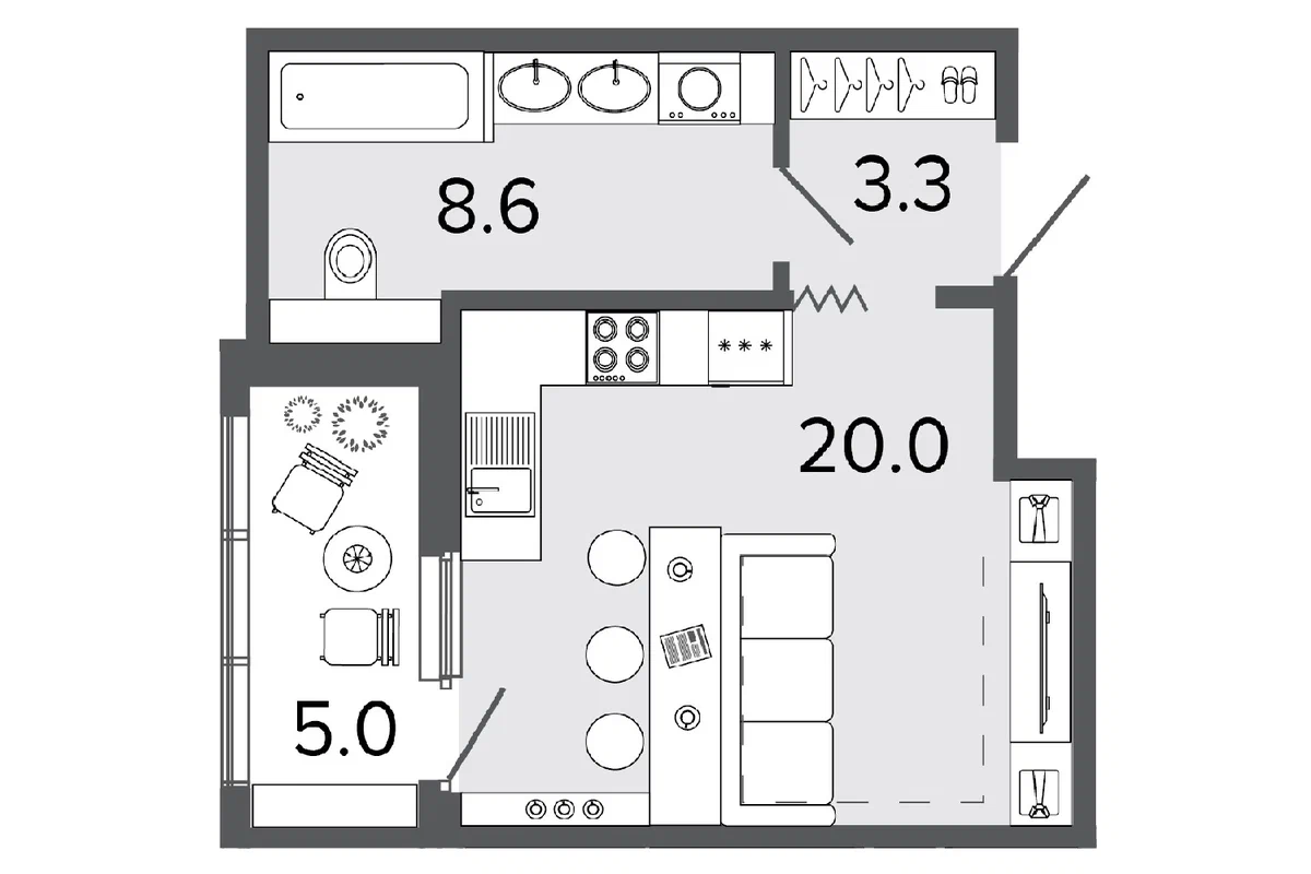А вот в жилых комплексах высоких категорий проектируют более разнообразные и комфортные варианты. Обычно это компактное жилье, но покупатели квартир высокого качества более требовательны, поэтому обращают внимание на эргономичность, продуманность планировки. Например, в квартире может быть предусмотрена гардеробная, просторная ванная комната