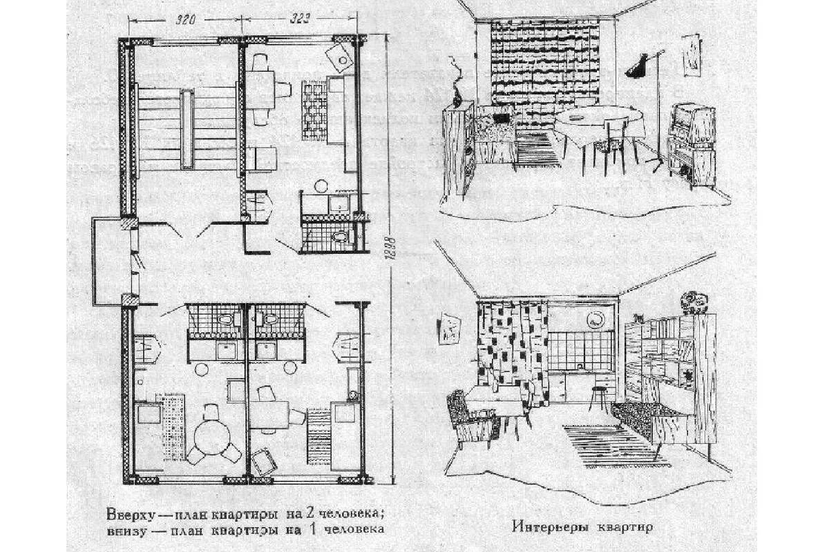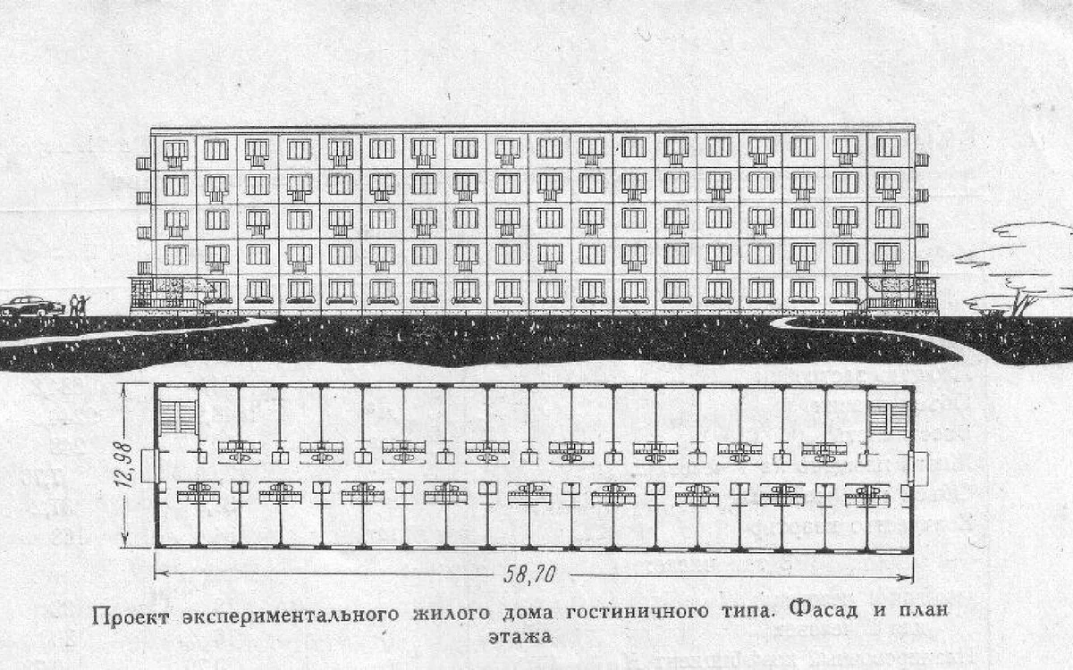 Помещения в экспериментальных домах обозначили как квартиры гостиничного типа. Дом был построен по коридорному принципу: по сторонам сквозного коридора расположены жилые ячейки. Всего по 168 на каждый дом.