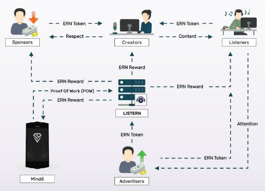 ERN TOKEN – A secured cryptocurrency token that is being transacted and used as a reward token within the Listern Audio Platform and can be verified by a pocket device miner. Mindé Pocket Miner – A device that has a mining capability and is responsible for validating the transaction within the ERN's ecosystem. Proof of work – is a work being done by a certain gadget or technology device that keeps the blockchain secured by validating the blocks being added to the blockhain by the users on the network. ERN Marketplace – is a marketplace within the Listern Platform where the “Sponsors” participates in the Creator's project.
