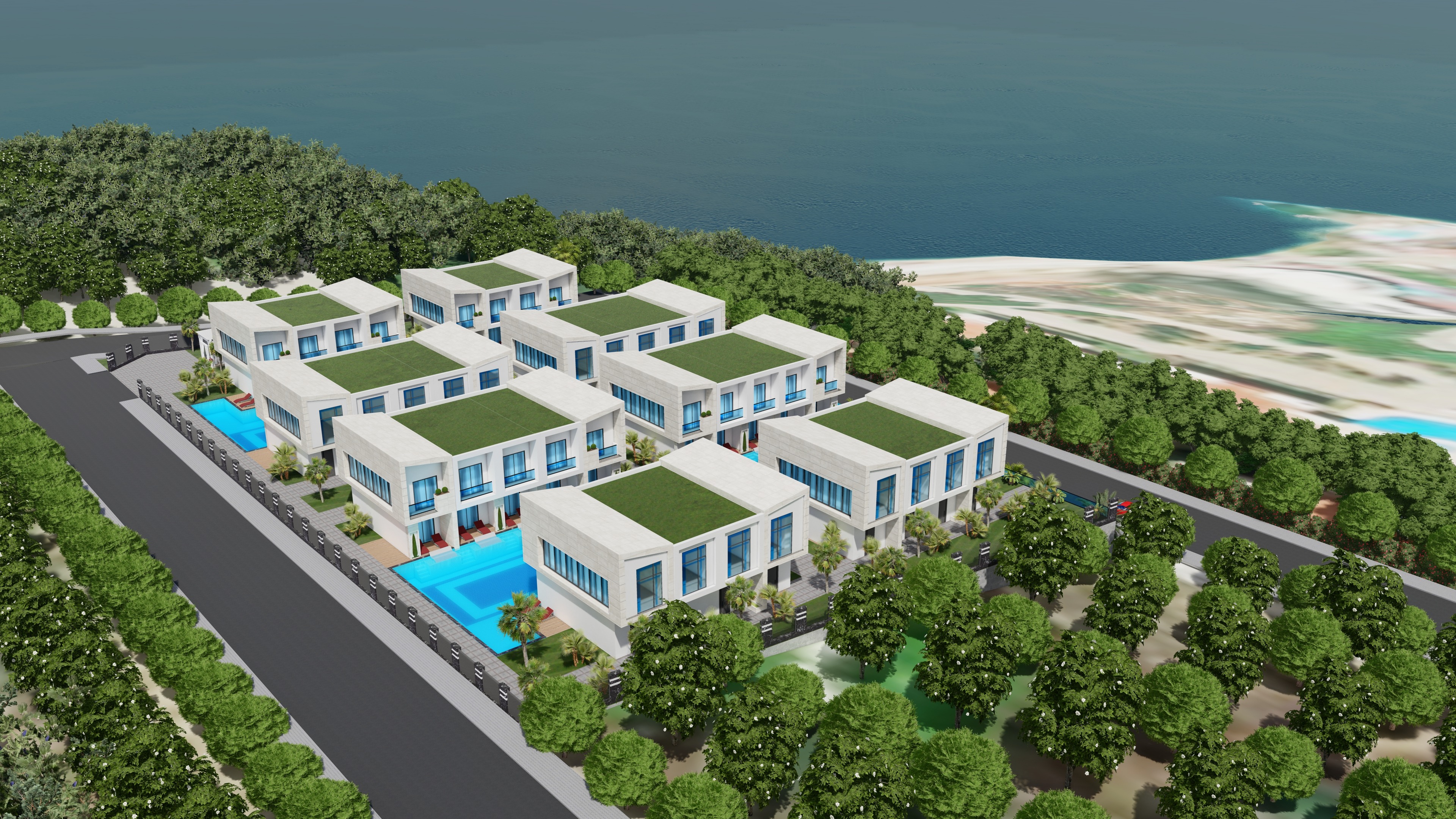 Проект занимает участок 5000 м2 состоит из 8-ми двухэтажных блоков, между которыми расположены бассейны, примыкающие к балконам апартаментов на первом этаже. Всего 36 апартаментов.