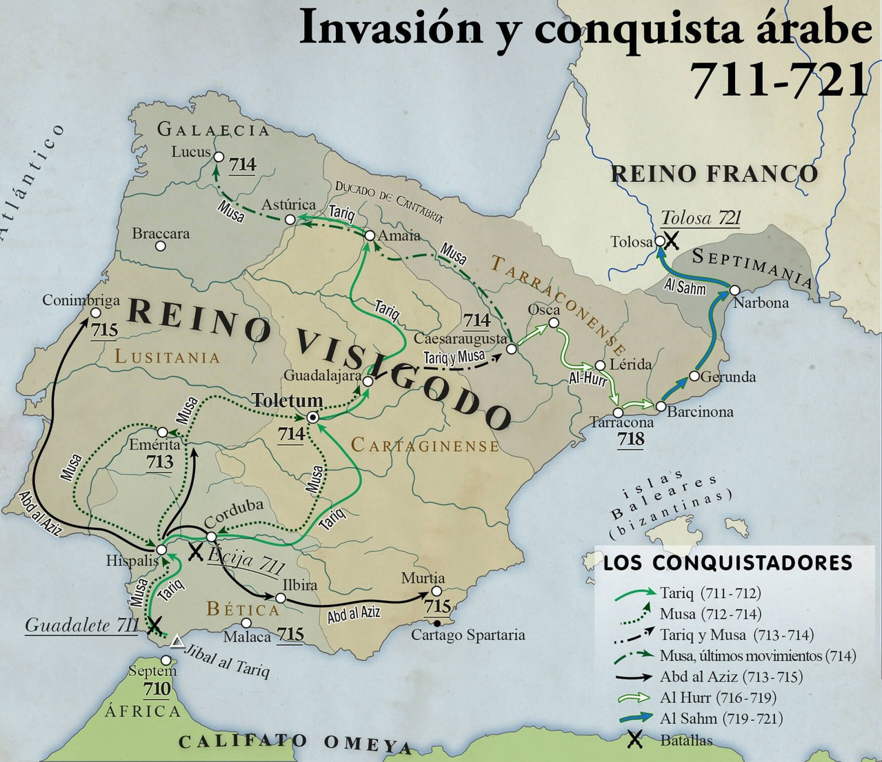 Habiendo diezmado los restos de las tropas visigodas en una segunda batalla cerca de la ciudad de Écija, Tariq procedió a conquistar el sur de la península. Viendo los éxitos de su lugarteniente, Musa en persona desembarcó en Hispania al frente de unas 15.000-20.000 personas y se sumó a la conquista, tomando ese mismo año la capital del reino, Toledo. Hacia 715, prácticamente todo el territorio peninsular estaba bajo control musulmán. La relativa rapidez de la conquista se explica por varias razones, algunas de las cuales ya han sido mencionadas. En primer lugar, la lucha interna por el poder dejó debilitado el Reino visigodo y causó su fragmentación tras la muerte de Rodrigo y las primeras derrotas sufridas. Muchos gobernadores optaron por rendir plazas fuertes, ciudades e incluso provincias enteras sin oponer resistencia, a cambio de pactos que les garantizaban ciertos privilegios y derechos bajo el dominio musulmán. Esto lleva a otro factor importante que facilitó la victoria de los seguidores de Mahoma. Las condiciones que los musulmanes imponían sobre los territorios ocupados eran mayoritariamente suaves. La población no musulmana de las regiones sometidas pacíficamente se veía obligada a pagar un tributo especial llamado yizia, pero conservaba su religión, sus bienes y costumbres, y frecuentemente gozaba de amplia autonomía política y económica. En este sentido, cabe destacar el ejemplo de los judíos, que sufrieron una ola de represiones bajo varios reyes visigodos. En cambio, el dominio islámico inicialmente les trajo una mejora notable de su situación y significó el fin de la persecución religiosa.