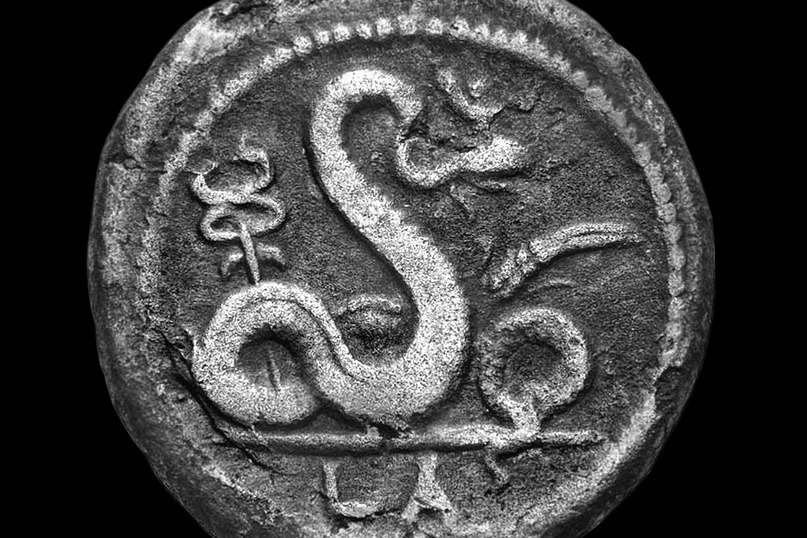Иногда его изображают вместе с кадуцеем или посохом Асклепия, выражая его возможные хтонические и целительные функции.