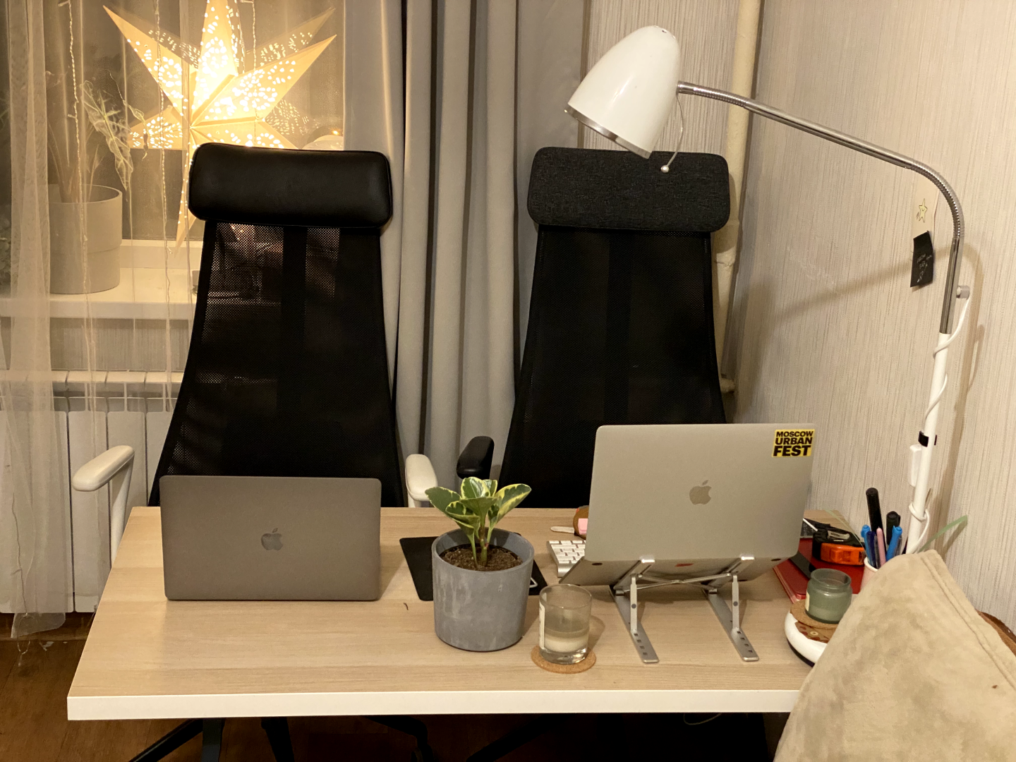 Всем, чем я пользуюсь дома на рабочем столе — всё подбирала под себя невеста. Она любит всё организовывать и улучшать, а я люблю некоторыми вещами аккуратно пользоваться. Например, она нашла ту самую штуку под ноги. Также она купила подставку под монитор, под мак, органайзеры и лампу. Разместила растения на столе и увлажнитель в комнате. За что я ей благодарен. Меня останавливает желание иметь свой кабинет, вот там-то я разгуляюсь! А сейчас пока и так вроде нормально…
