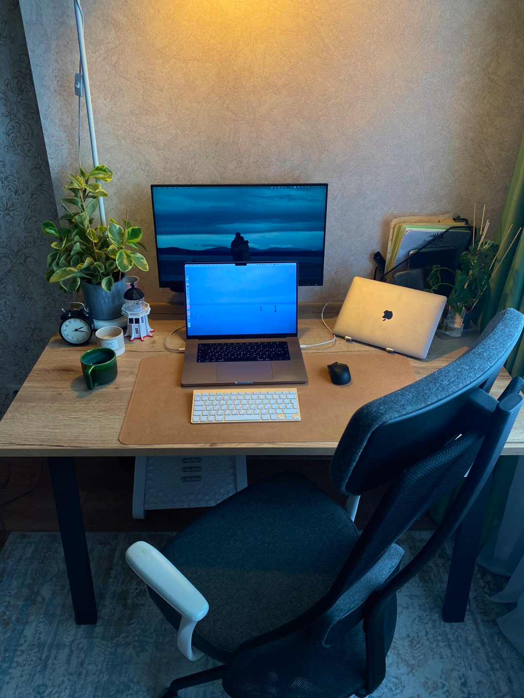 Пейте воду. Делайте перерывы. Обедайте вовремя, не взирая на созвоны, можно и помолчать. Стол глубиной минимум 80 см. Ищите своё кресло, осанка это важно. Подставка под ноги мастхев. Устраивайте окружение по внутреннему комфорту, но не борщите с деталями, могут отвлекать. Используйте монотонную приятную атмосферную музыку с минималистичными тонами тогда, когда хочется войти в поток и подвигать пиксели в Фигме, буквы в редакторе кода или цифры в Экселе. Прислушивайтесь к внутренним ощущениям и будьте честны с собой — возможно вы носите внутренний комфорт внутри и вам будет удобно даже на табуретке под пальмой где-то на Фиджи.