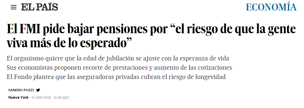 "El Fondo reclama, entre otras medidas, que se recorten las prestaciones y se retrase la edad de jubilación ante ´el riesgo de que la gente viva más de lo esperado´. Propone soluciones para mitigar ese ´riesgo de longevidad´".
